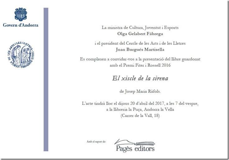 Presentació del llibre guardonat amb el Premi Fiter i Rossell 2016: 'El xiscle de la sirena' de Josep Maria Ràfols. Editat per Pagès editors.