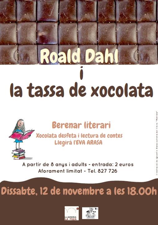 Mentre degustem una bona tassa de xocolata desfeta, escoltarem contes de Roald Dahl de la mà de l'Eva Arasa. Enmig dels contes hi haurà algunes notes biogràfiques i acompanyament musical.